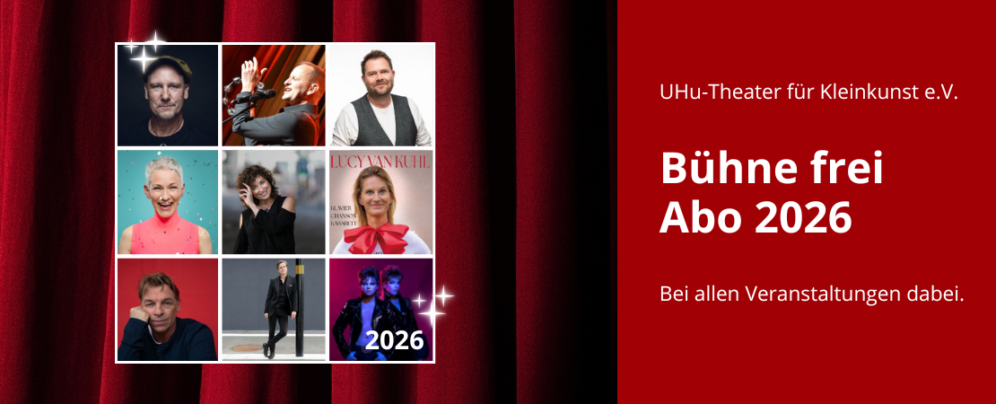 Du liebst Kleinkunst, Kabarett und besondere Abende im UHu-Theater? Dann ist unser neues Bühne frei – Abo 2026 genau das Richtige für Dich. Neun handverlesene Veranstaltungen, großartige Künstlerinnen und Künstler – und das alles zum Vorteilspreis.
